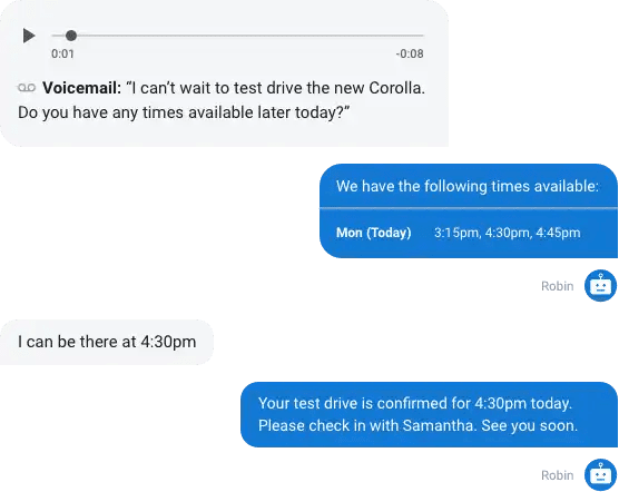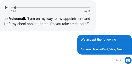 Robin, our chatbot, engages callers immediately by sending answers to frequently asked questions in their voicemails.